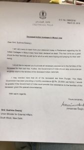 Punjab Chief Minister Captain Amarinder Singh has written a letter to External Affairs Minister Sushma Swaraj, expressing shock and grief at the confirmation of the murder of 39 Indians in Iraq. In the letter he has also requested the centre to give financial assistance to the bereaved family members, noting that the government of Punjab has already been paying them a sum of Twenty Thousand Rupees every month.
