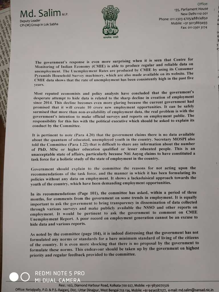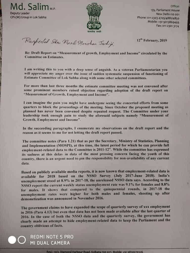 Salim’s letter, although does not name the members who opposed the adoption of the report, suggests that the same has been done in order to keep data on unemployment from coming into public domain.
