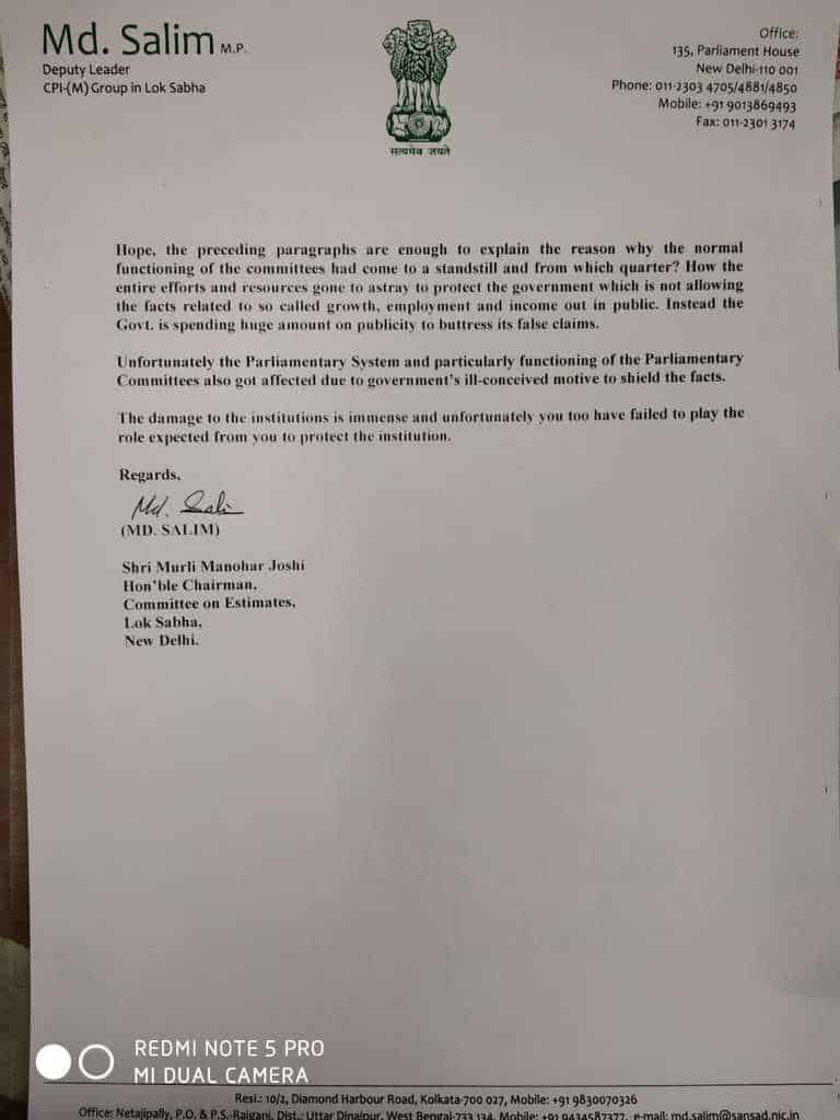 Communist Party of India (Marxist) MP and member of the Lok Sabha Committee on Estimates Md. Salim has written a scathing letter to Chairperson Murli Manohar Joshi over the “systematic suspension of the functioning” of the committee.