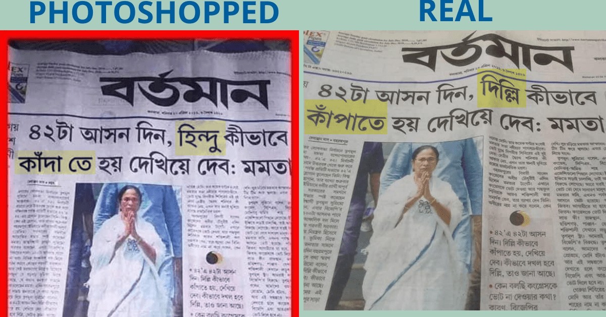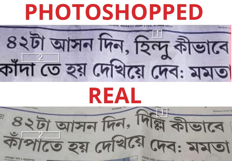 As evident, a few words of the original headline have been replaced. The word “দিল্লি (Delhi)” has been edited to “হিন্দু (Hindu)” and the word “কাঁপাতে (shake)” has been replaced with “কাঁদা তে (cry)”. The original headline reads, “৪২টা আসন দিন, দিল্লি কীভাবে কাঁপাতে হয় দেখিয়ে দেব: মমতা (Give me 42 seats and I will show you how to shake things up in Delhi.)”