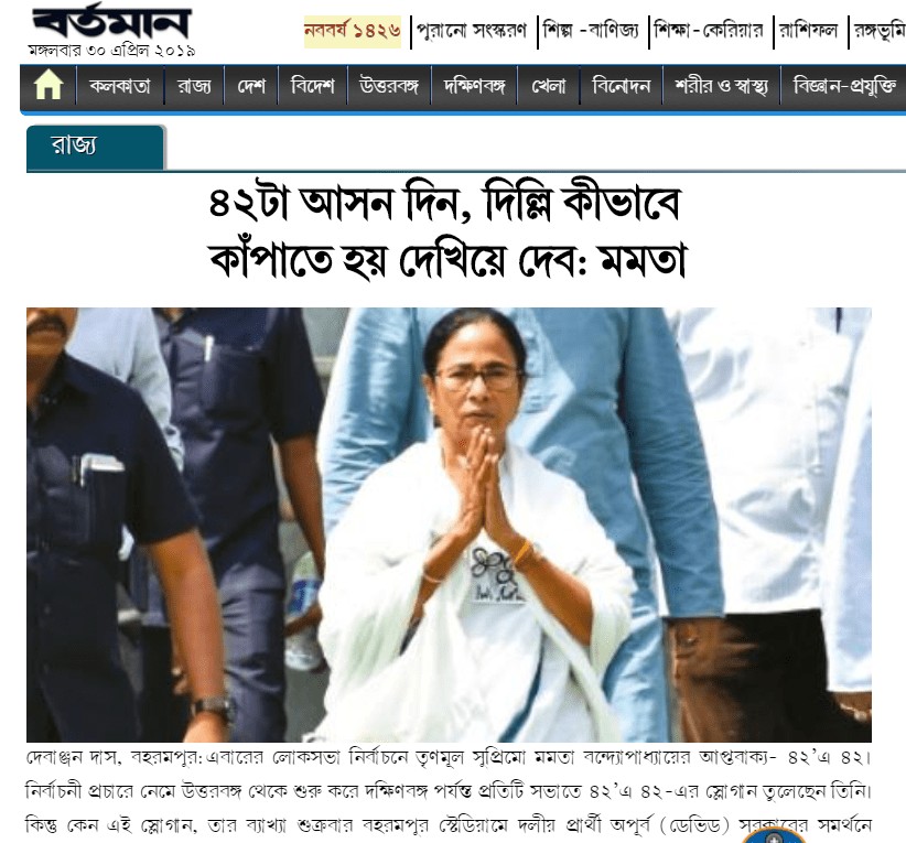 A purported newspaper clipping of popular Bengali daily বর্তমান (Bartaman) is shared on social media with its headline reading, “৪২টা আসন দিন হিন্দু কীভাবে কাঁদা তে হয় দেখিয়ে দেব: মমতা (Give me 42 seats & I’ll show you how to make the Hindus cry: Mamata)”