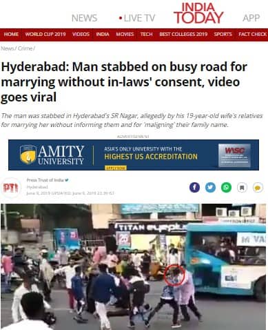 This 20-year-old man was dragged out of the car and hacked with knives in front of his #teen wife by her father and three brothers in #Hyderabad pic.twitter.com/QuyTakWroO