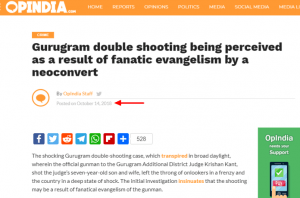 OpIndia’s reportage was similar to that of Swarajya’s. Its October 14 article was titled – “Gurugram double shooting being perceived as a result of fanatic evangelism by a neoconvert.”