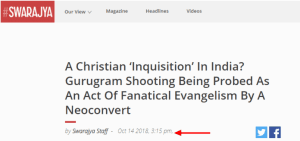 On October 14, Swarajya published an article titled – “A Christian ‘Inquisition’ In India? Gurugram Shooting Being Probed As An Act Of Fanatical Evangelism By A Neoconvert”. The title suggested that the ‘religious conversion’ angle wasn’t something that came up during police investigation but was being probed as a probable motive behind the murder.