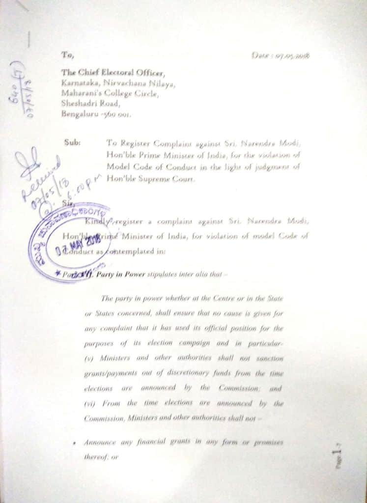 The Congress registered a complaint on Monday against Prime Minister Narendra Modi for violating the Model Code of Conduct (MCC) in light of the Supreme Court judgement on the Mahdayi issue.