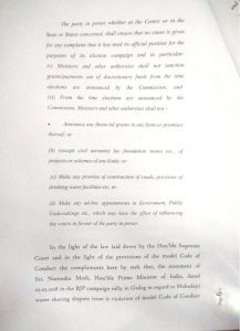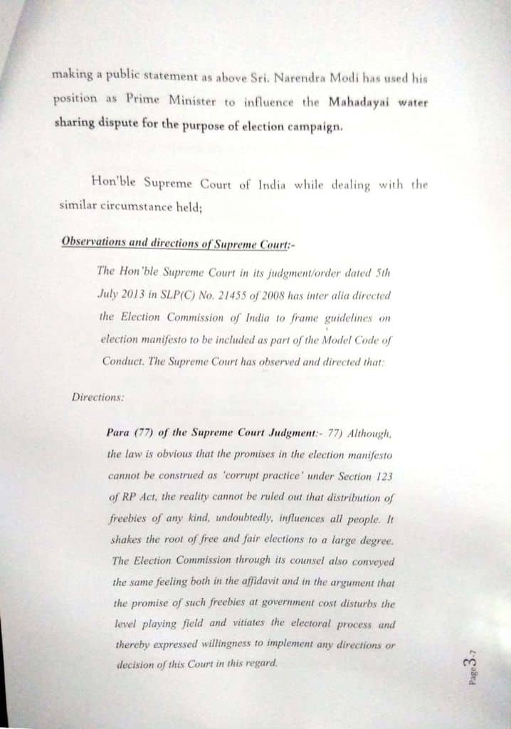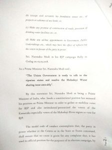 “The Union government is ready to talk to the riparian states and resolve the Mahadayi water sharing issue amicably,” Modi had said in his Gadak rally on May 5 in clear violation of the poll conduct rules, the Congress party said in the complaint.