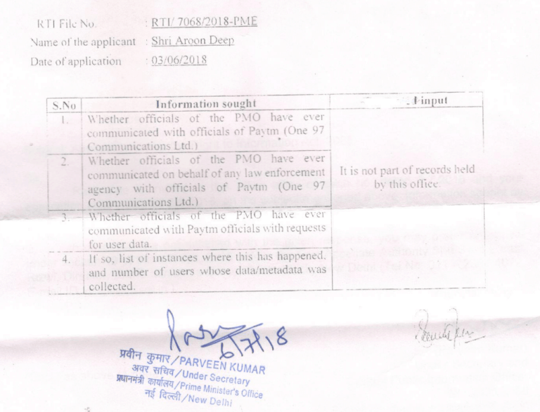 The Prime Minister’s Office (PMO) refused to disclose whether it asked Paytm for any user data. An RTI application was filed by media organisation Medianama.