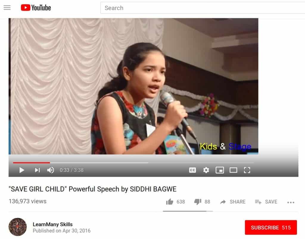 Using reverse image search, Alt News found that the picture of the girl was taken from a 3 year old Youtube video titled, “SAVE GIRL CHILD Powerful Speech by SIDDHI BAGWE”. According to the description, this video was shot at St. Joseph’s High School in Vikhroli, a suburb of Mumbai.