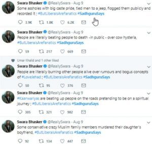 After self-styled Godman Sadhguru’s comment that “liberals are fanatics”, Swara Bhasker sent out a series of tweets using the hashtags #ButLiberalsAreFanatics #SadhguruSays. She made out multiple tweets related to atrocities that took place across the country in recent times.
