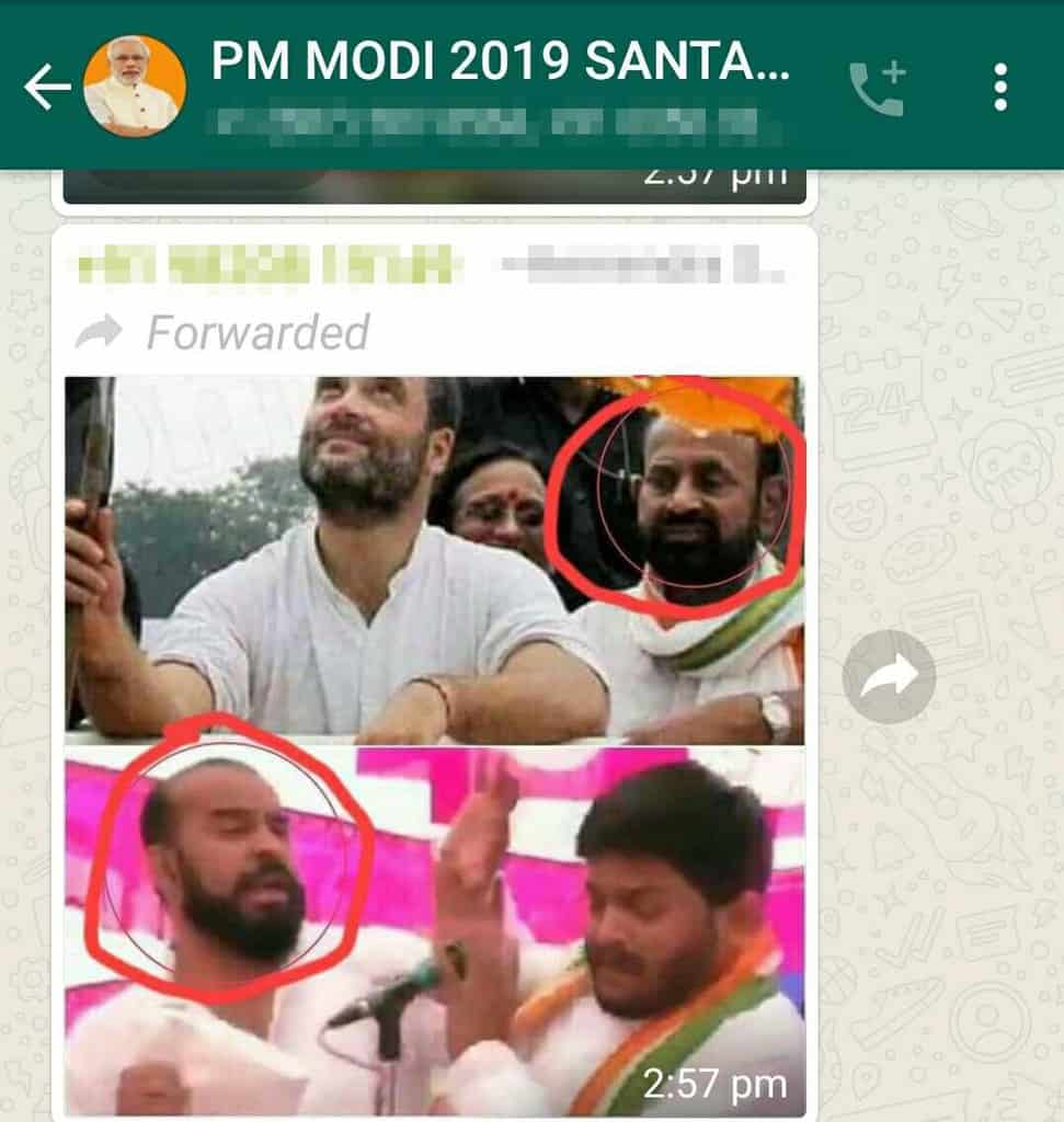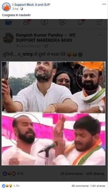 Hardik Patel, who is a Patidar leader from Gujarat and joined Congress earlier this year, was reportedly slapped by one Tarun Gajjar at a rally in Surendranagar, Gujarat. Soon after the incident, a Facebook page, I Support Modi ji and BJP, shared a collage of two pictures featuring Congress president Rahul Gandhi and Hardik Patel. In the image placed at the top, Gandhi is flanked by an unidentified person, while in the bottom image, a picture of the incident where Patel was slapped at a rally has been placed. It is being claimed that the man who attacked Patel was also seen with Rahul Gandhi at some other event in the past. It implicitly suggests that the accused in this incident is a Congressman and ergo, it’s a “Congress gimmick”.
