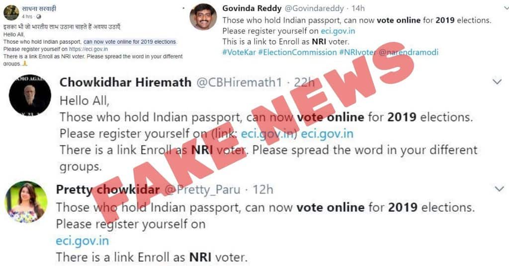 It claims that any Non-Resident Indian (NRI), who holds an Indian passport can now vote online by registering themselves on the website of Election Commission of India (ECI). A link to the official website of ECI was also attached to the message. Multiple social media users on Twitter and Facebook have shared the same message.