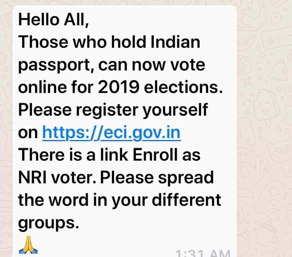 A message regarding the availability of an online voting facility for Non-Indian Residents (NRIs) in 2019 general elections is doing the rounds on social media. The message says, “Hello All, Those who hold Indian passport, can now vote online for 2019 elections. Please register yourself on https://eci.gov.in There is a link Enroll as NRI voter. Please spread the word in your different groups.”.