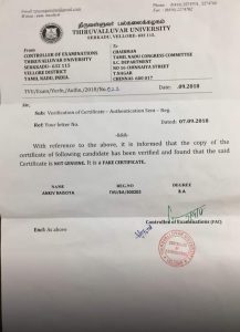 Thiruvalluvar University clearly refused to have enrolled a student of such name.
