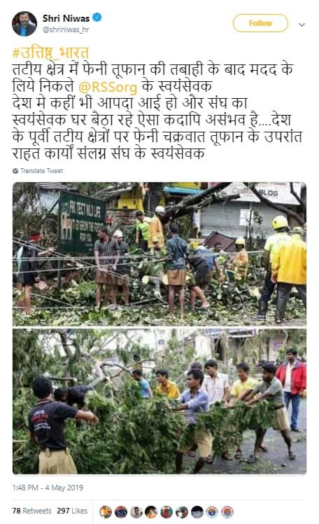 Shri Niwas, the National Joint Organising Secretary of Bharatiya Janata Party’s student wing ABVP, tweeted two images that show RSS workers lifting uprooted trees. “तटीय क्षेत्र में फेनी तूफान की तबाही के बाद मदद के लिये निकले @RSSorg के स्वयंसेवक देश मे कहीं भी आपदा आई हो और संघ का स्वयंसेवक घर बैठा रहे ऐसा कदापि असंभव है….देश के पूर्वी तटीय क्षेत्रों पर फेनी चक्रवात तूफान के उपरांत राहत कार्यों संलग्न संघ के स्वयंसेवक (After devastation in the coastal state due to Cyclone Fani, RSS workers offer help. It is impossible that disaster strikes the country and swayamsevaks are sitting at home. RSS swayamsevaks providing relief after Cyclone Fani strikes eastern coastal regions),” is the caption he used to share the images.