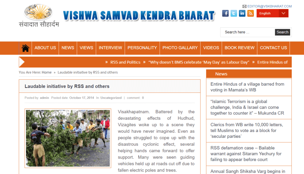 The image on the bottom was traced back to 2014 using reverse-image search on Yandex. Vishwa Samvad Kendra’s pan-India website carried the photograph in an October 2014 article, according to which it pertains to RSS relief work in Vishakhapatnam during Cyclone Hudhud.