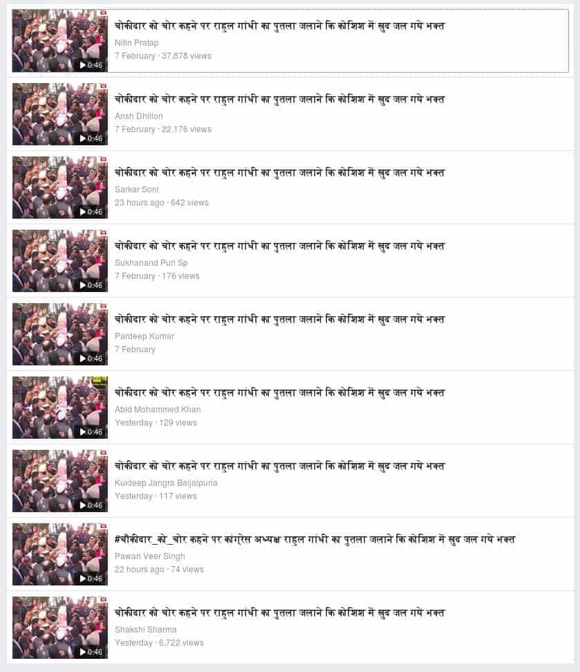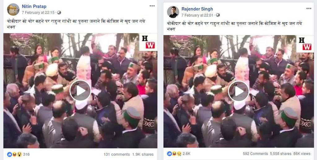 “चोकीदार को चोर कहने पर राहुल गांधी का पुतला जलाने कि कोशिश में खुद जल गये भक्त (In an attempt to burn an effigy of Rahul Gandhi, BJP supporters ended burning themselves .They wanted to burn his effigy because he had called Prime Minister Narendra Modi a ‘thief’ -translated), read a caption affixed with a video. The video shows a group of people being accidentally set on fire while trying to burn an effigy. Two individual Facebook users, Nitin Pratap and Rajendra Singh have shared this video with an identical narrative. It has attracted a combined view count in excess of 1,20,000 already.