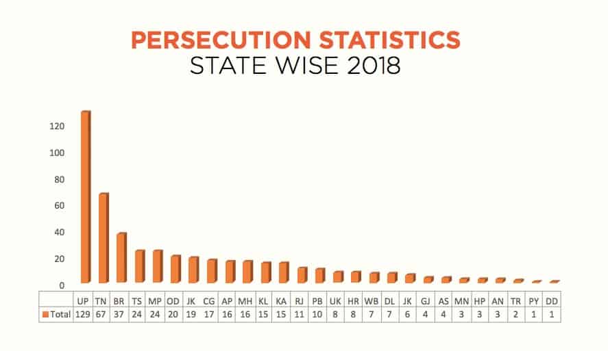 59% of incidents in 2018 were reported from Uttar Pradesh, Tamil Nadu, Bihar, Madhya Pradesh and Telangana. Uttar Pradesh is termed the most hostile state, with 129 validated incidents reported, an 87 per cent increase from 2017. “Sources state that these are only a fraction of the actual violence perpetuated and reported on the ground. Religious organisations have mushroomed across the landscape of Uttar Pradesh, with many reports of vigilantism and incidents of lynching with impunity.”