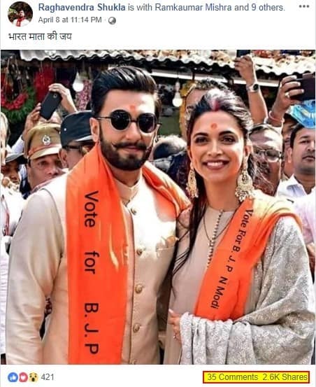 A photograph of movie stars Ranveer Singh and Deepika Padukone has been posted by a page on Facebook. The photograph shows the two sporting saffron scarves on which ‘Vote for BJP N Modi’ is printed. The text accompanying the image reads, ‘कमल का बटन दबाकर देश की तरक्की में भागीदार बनें’ (Press the lotus button, become a part of the nation’s progress- translated).