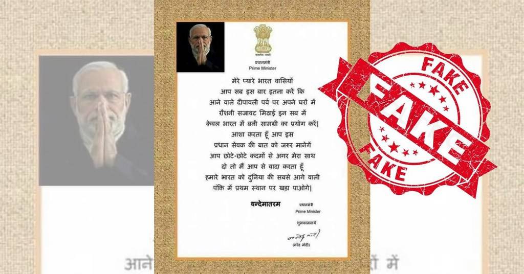 An appeal to buy and promote ‘Made-in-India’ products on Diwali was falsely attributed to Prime Minister Narendra Modi by manufacturing a fake letter with his ‘signature’.