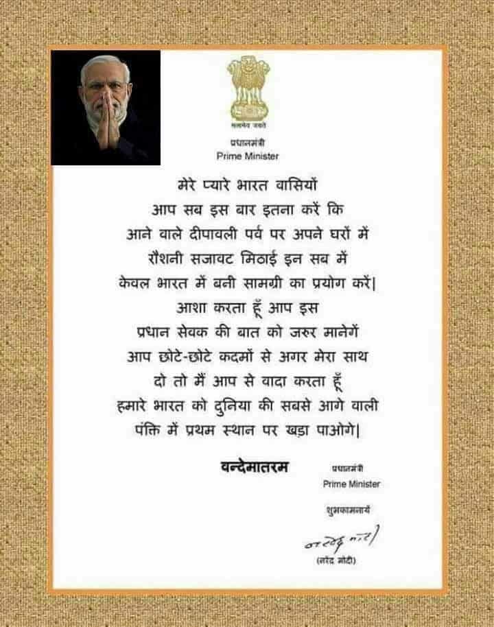 A letter claimed to be written by Prime Minister Narendra Modi is doing the rounds on social media. The letter urges citizens of India to buy only India-made products this Diwali. The letter has a signature of the Prime Minister. Several users have sent Alt News requests to fact-check this letter on its official app.