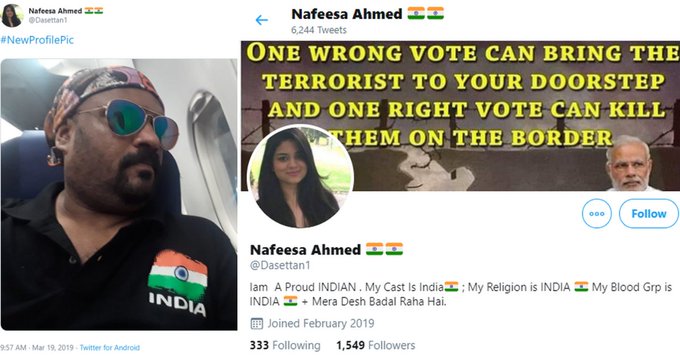 The Twitter account Nafeesa Ahmed (@Dasettan1) was created in February this year. The person behind the handle is a devout and vocal supporter of Prime Minister Modi.
