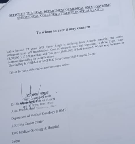 Last year, BMT RK Birla Cancer SMS Hospital, Jaipur gave an estimate of Rs 10 lakh for Lalita’s treatment. A letter stating the same was recently tweeted by TOI journalist Arvind Chauhan.