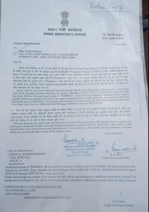 Chauhan shared the PMO’s response in a June 23, 2019 tweet. The letter said, “Please refer to your letter dated nil received through Shri Rajveer Singh (Raju Bhaiya)…letter dated 14/07/2018, regarding financial assistance for Aplastic Anaemia of Miss Lalita Kumari…The Prime Minister has sanctioned a grant of Rs 300000.0/- from the Prime Minister’s National Relief Fund to partially defray the expenses involved in the surgery/treatment subject to the conditions mentioned overleaf…”