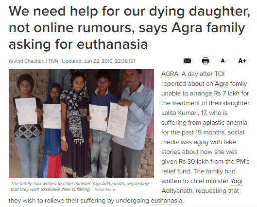 Alt News contacted Chauhan who said that the state government has now stepped in and offered to help the girl. “CMO Agra has offered to arrange for free treatment for Lalita at SGPGI Lucknow,” he told Alt News. This was also reported in the media.