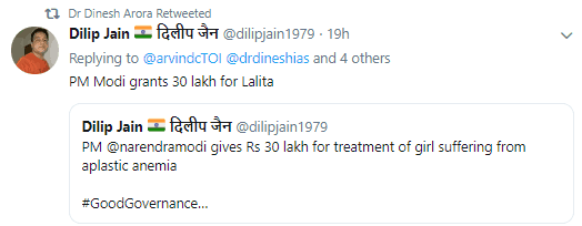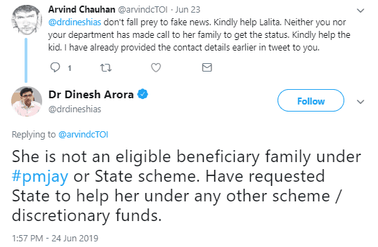 Not only did the media circulate incorrect information but Dr Dinesh Arora, the deputy CEO of PM’s flagship health scheme Ayushman Bharat, retweeted a tweet which wrongly claimed that Rs 30 lakh was granted to the family.