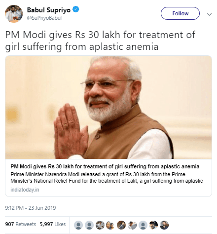 BJP West Bengal MP Babul Supriyo tweeted the India Today story, thus attracting nearly 6,000 likes and over 900 retweets to the claim that PM Modi sanctioned a grant of Rs 30 lakh to the ailing child.