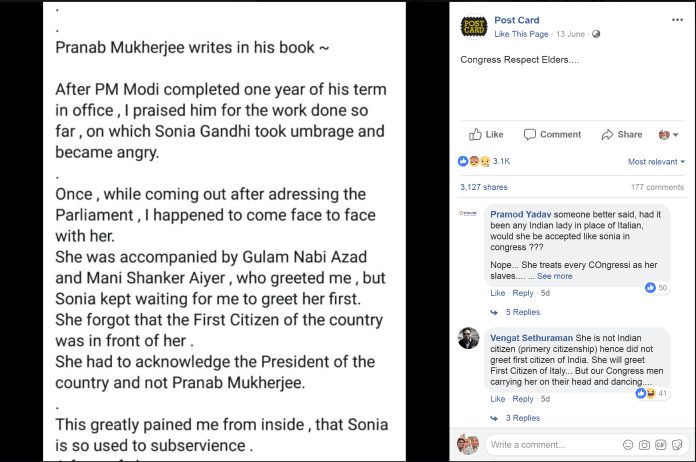 “After PM Modi completed one year of his term in office, I praised him for the work done so far, on which Sonia Gandhi took umbrage and became angry. Once, while coming out after addressing the parliament, I happened to come face to face with her. She was accompanied by Gulam Nabi Azad and Mani Shanker Aiyer, who greeted me but Sonia kept waiting for me to greet her first. She forgot that the First Citizen of the country was in front of her. She had to acknowledge the President of the country and not Pranab Mukherjee. This greatly pained me from inside, that Sonia is so used to subservience.” If Postcard News is to be believed, these are words of former President Pranab Mukherjee extracted from his book. But then Postcard News is not to be believed.