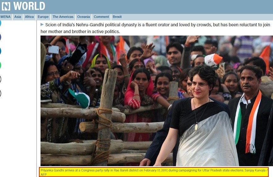 Alt News found that the image dates back to February 2017. Posted by The National, the description below the image says, “Priyanka Gandhi arrives at a Congress party rally in Rae Bareli district on February 17, 2017, during campaigning for Uttar Pradesh state elections. Sanjay Kanojia / AFP”.