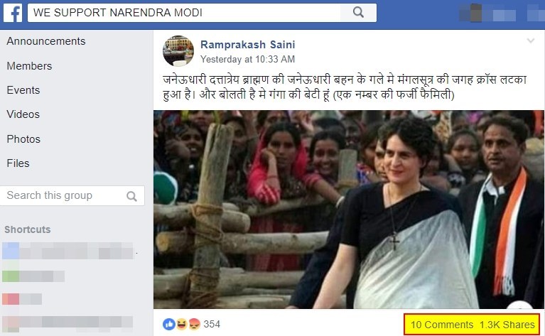 One of the groups which has posted it is WE SUPPORT NARENDRA MODI. The post is by a group member and has been shared more than 1300 times so far.