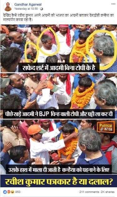 False Claim: Ravish Kumar Set Up a Man to Wear BJP Cap Before Garlanding Kanhaiya Kumar