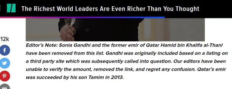 On November 29, 2013, Huffington Post had published a story on the richest world leaders and placed Sonia Gandhi in the 12th position (not 4th as claimed by Patra). However, the former INC President’s name was subsequently removed from the story as the information’s source, as clarified later by Huffington Post, was “called into question.”
