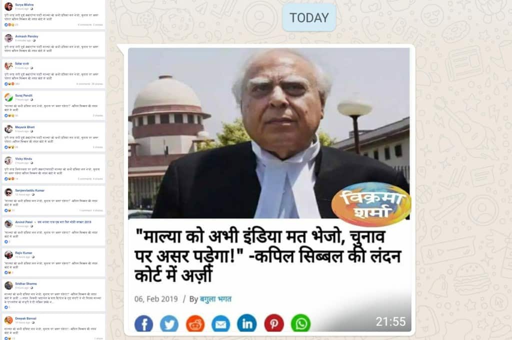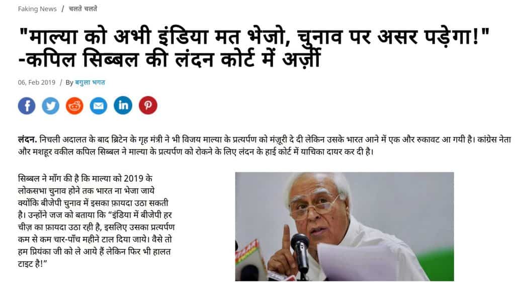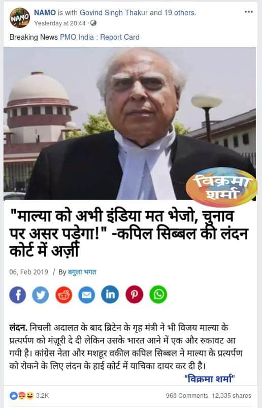 A screenshot of a report attributing a statement to senior Congress leader Kapil Sibal has been widely shared on social media. The title of the report reads, “माल्या को अभी इंडिया मत भेजो, चुनाव पर असर पडे़गा!” -कपिल सिब्बल की लंदन कोर्ट में अर्ज़ी (Don’t send Mallya to India right now, it will affect the election! ” -Kapil Sibal’s application in  London court -translated)”. Facebook page NAMO posted the screenshot with a misleading caption, “Breaking News”. At the time of writing the article, the post had garnered close to 13,000 shares.