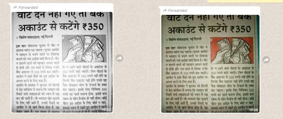 “लोकसभा चुनावों में वोट देने नहीं गए तो बैंक अकाउंट से कटेंगे ₹350” (If you don’t cast your vote in the Lok Sabha election, Rs 350 will be deducted from your bank account -translated), reads the headline of what appears to be a newspaper clipping, viral on social media. The report also quotes a spokesperson of the Election Commission of India saying that Rs 350 will be deducted from the bank accounts of those who do not cast their votes in the upcoming general election. The screenshot of this clipping was reported by several social media users to Alt News with queries regarding its authenticity.
