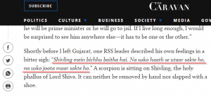 This is what Tharoor said at the Bangalore Literature Festival on October 28: “There is an extraordinarily striking metaphor expressed by an unnamed Rashtriya Swayamsevak Sangh (RSS) source to the journalist Vinod Jose of the Caravan, which I quote. In which they expressed their frustration in their inability to curb Modi. Modi is like a scorpion sitting on a Shivling, you cannot remove him with your hand and you cannot hit it with a chappal either.”