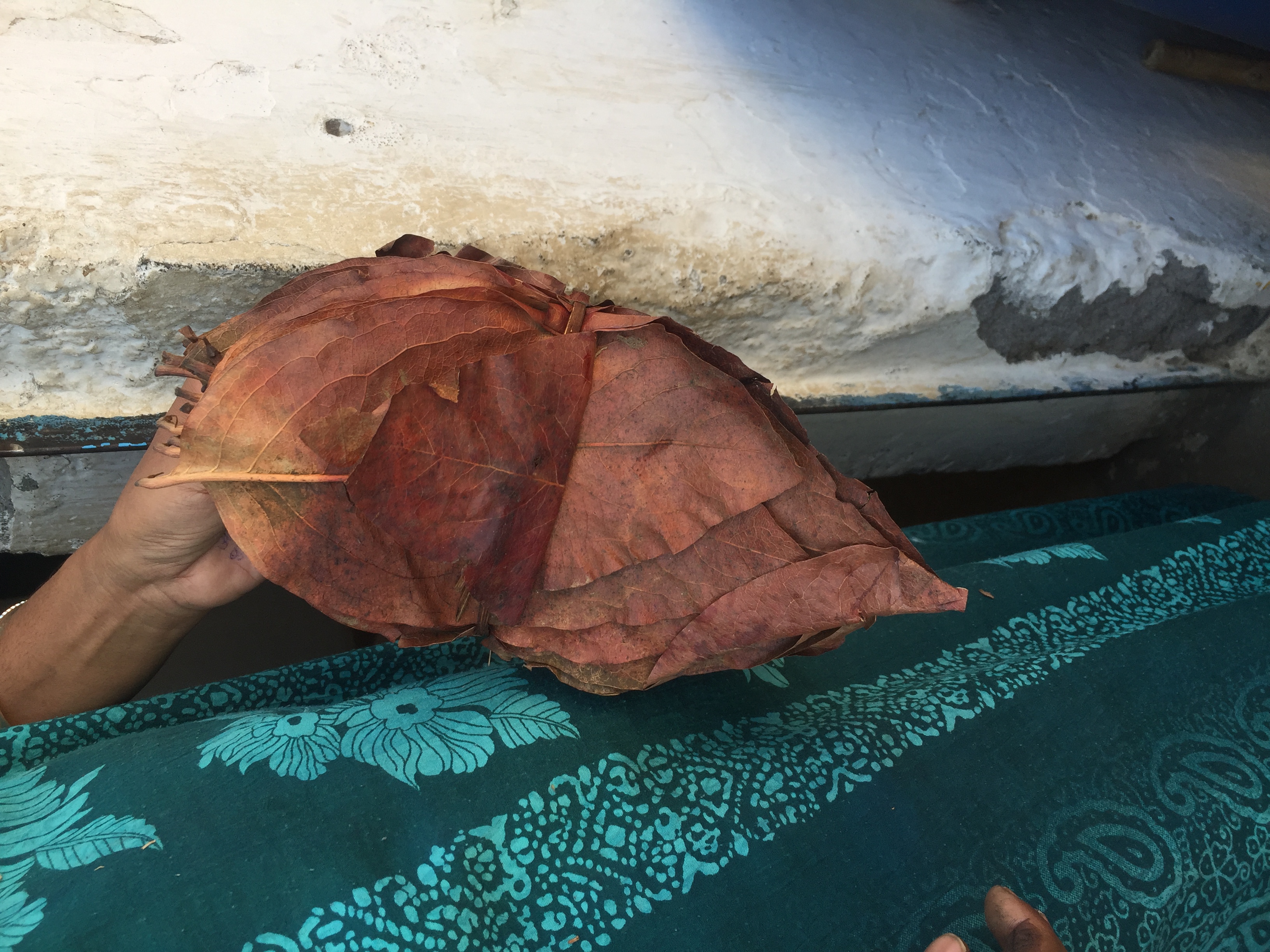 A beedi worker shows poor-quality tendu leaves given by a factory owner.