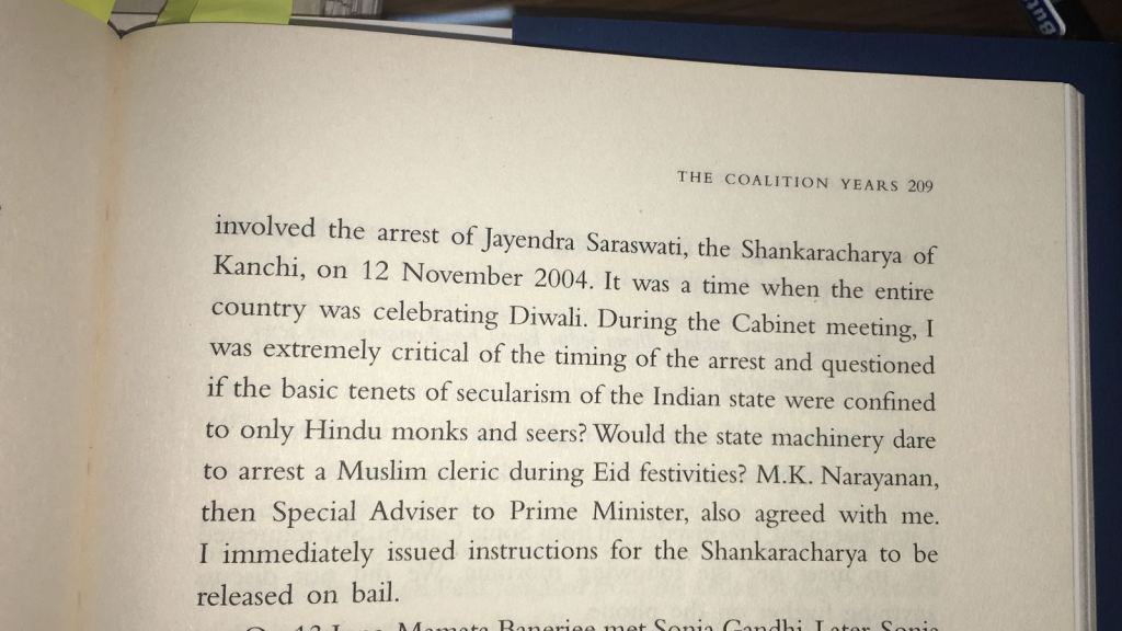 Mukherjee recalls how he was in thorough disagreement over the arrest of the Shankaracharya at a time when Diwali festivities are on, and was “extremely critical of the timing of the arrest and questioned if the basic tenets of secularism of the Indian state were confined to only Hindu monks and seers? Would the state machinery dare to arrest a Muslim cleric during Eid festivities?”