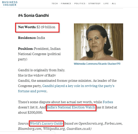 The false claims about Sonia Gandhi’s net worth have been floating on social media for quite some time now. As revealed through the course of this article, the misinformation originated on a flimsy website (‘World’s Luxury Guide’) which doesn’t exist anymore. Media outlet Business Insider picked up the story, which was then used by Huffington Post and subsequently by The Times of India.