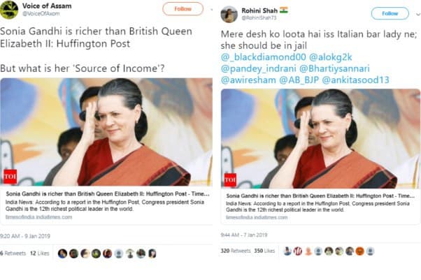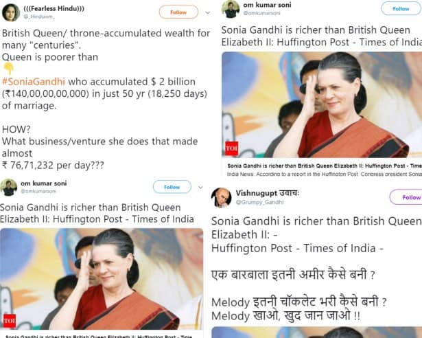 The claim that ‘Sonia Gandhi is richer than Queen Elizbeth-II’ was shared on Twitter by many followed by top BJP leaders. Users Rohini Shah and Voice of Assam were among those who circulated the TOI article and are followed by Prime Minister Narendra Modi.