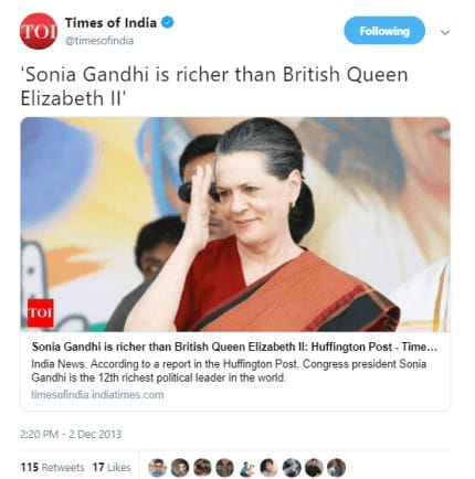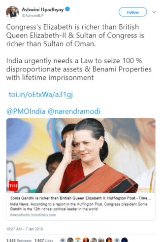 BJP spokesperson Ashwini Upadhyay recently tweeted a 2013 report by The Times of India and claimed that Sonia Gandhi is richer than Queen Elizabeth-II and the Sultan of Oman. He circulated the claim on both Twitter and Facebook, drawing a combined share (plus retweet) count of nearly 1,600.