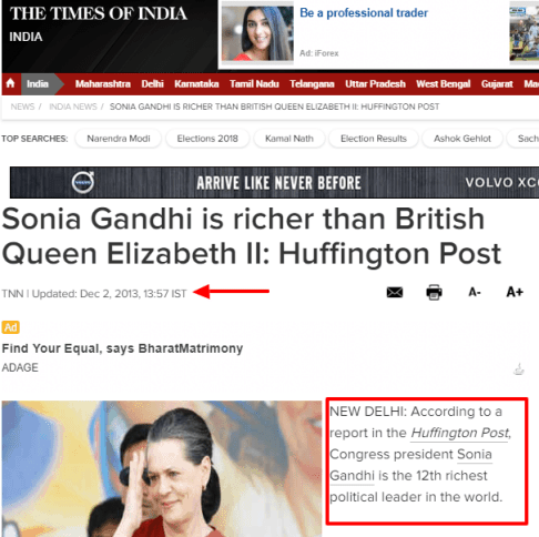 The 2013 report by TOI attributed the source of the information to Huffington Post, according to which, “Sonia Gandhi is the 12th richest political leader in the world.”