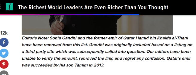 Alt News found that on November 29, 2013, Huffington Post had indeed published a story on the richest world leaders and placed Sonia Gandhi in the 12th position. However, the former INC President’s name was subsequently removed from the story as the information’s source, as clarified later by Huffington Post, was “called into question.”