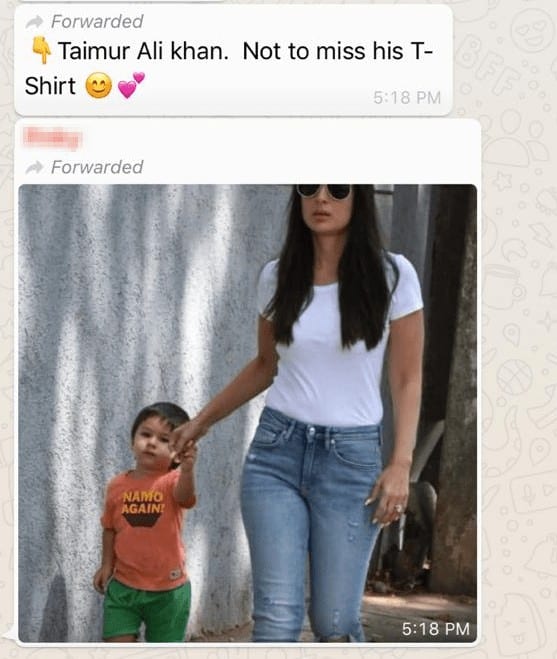 The photograph of Taimur has also been shared on WhatsApp with the same caption – ‘Taimur Ali khan….Not to miss his T Shirt’.