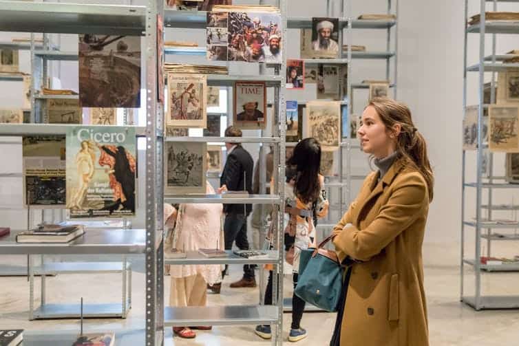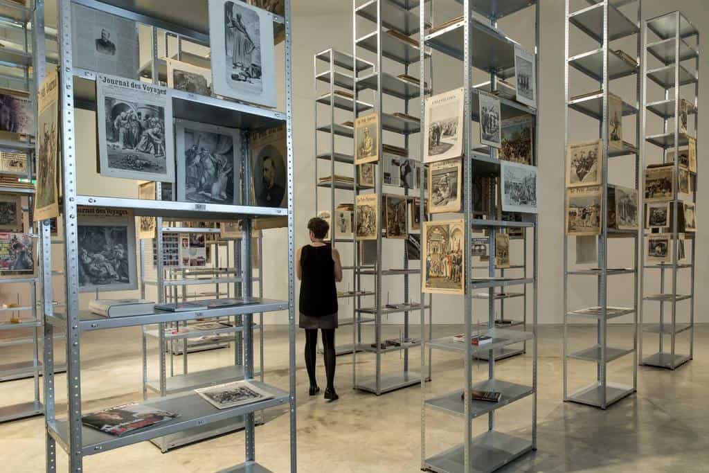 The Culture of Fear is a kind of library, displaying images and illustrations from 19th, 20th and 21st century books, newspapers and magazines. These are hung from hardware variety steel shelves usually synonymous with household garages. In Attia’s creation the shelves are interlocked and transformed into dangerously high towers, evoking New York’s Twin Towers.