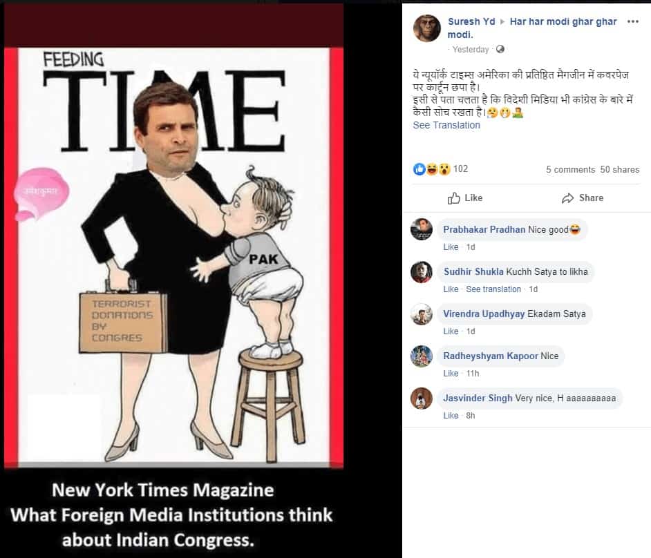 A caricature of Rahul Gandhi has been shared on social media claiming that it was published on a cover page of The New York Times. “ये न्यूयॉर्क टाइम्स अमेरिका की प्रतिष्ठित मैगजीन में कवरपेज पर कार्टून छपा है। इसी से पता चलता है कि विदेशी मिडिया भी कांग्रेस के बारे में कैसी सोच रखता है। (This cartoon was published on a cover page of the reputed American magazine New York Times. This shows what international media thinks of Congress.)” – reads the accompanying caption. The post below was made by a Facebook page ‘Har har modi ghar ghar modi’.