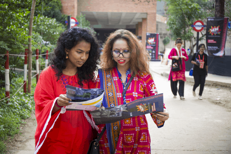 Young women looking at the WOW festival programme, Dhaka, 2019. | Photo: Muhmmad Murtada, British Council