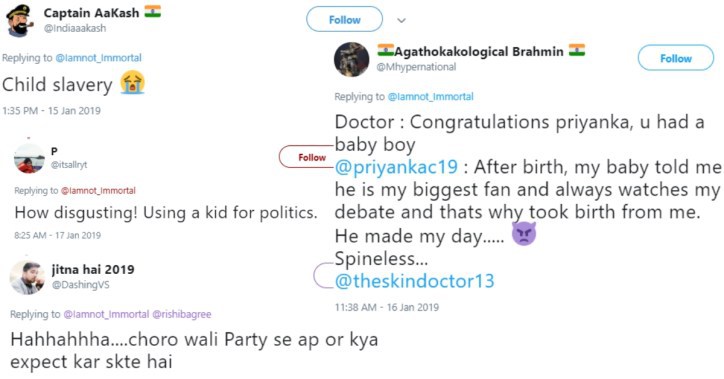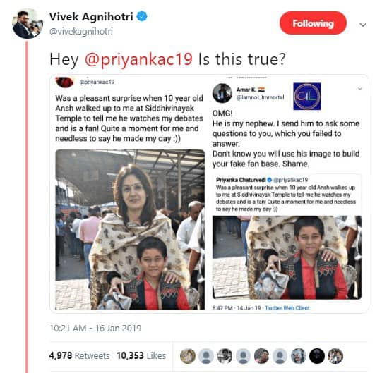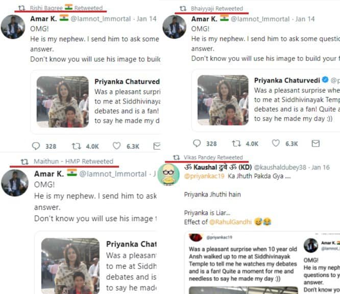 On January 13, Congress spokesperson Priyanka Chaturvedi tweeted a photograph with a child saying that he walked up to her as a fan who has watched her debates. Within hours, a person named Amar K. (@Iamnot_Immortal) claimed that the boy in the picture is his nephew and that he had sent him to ask Chaturvedi a few questions which she was unable to answer. Amar K’s tweet was retweeted over 4,000 times.